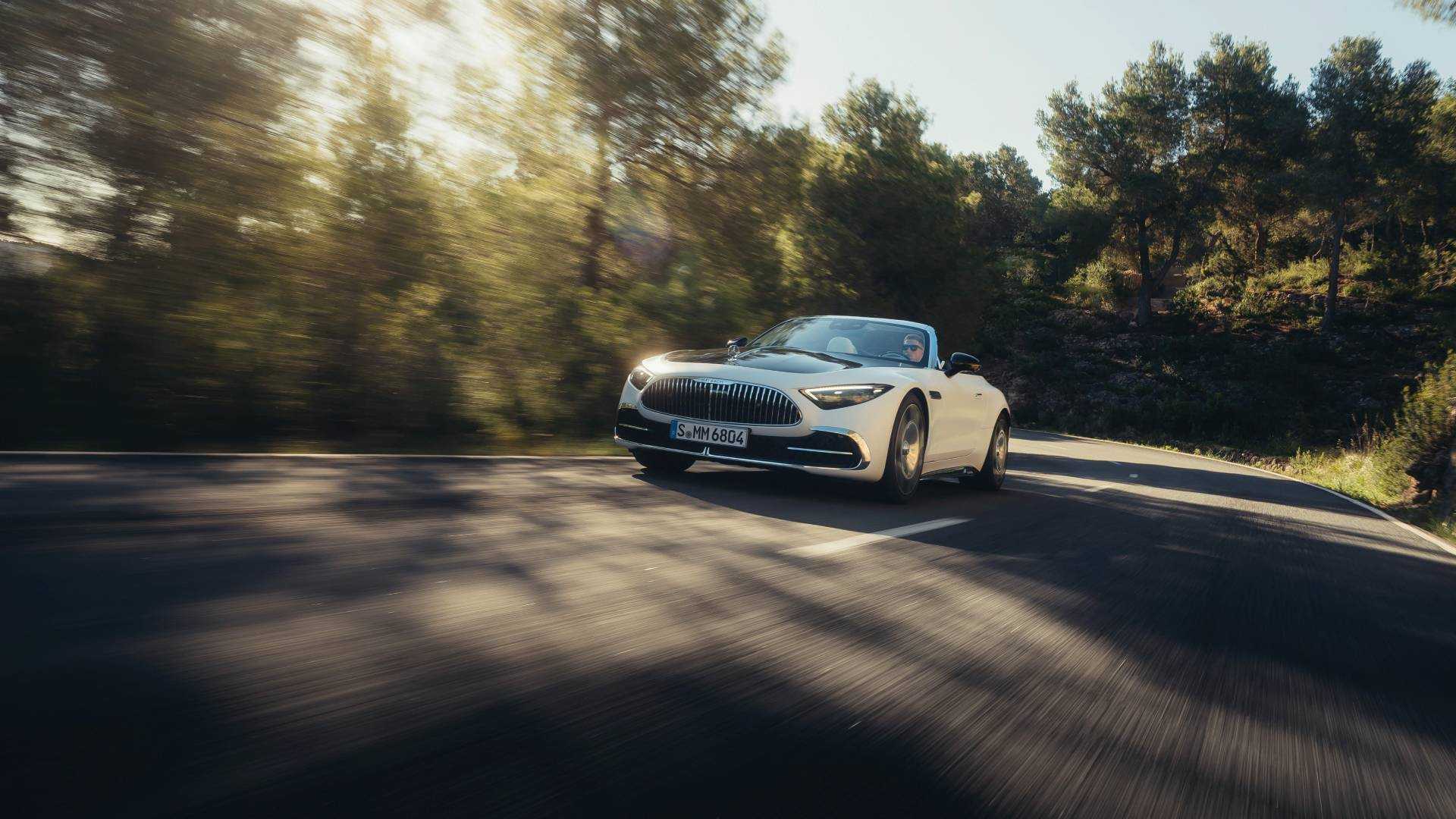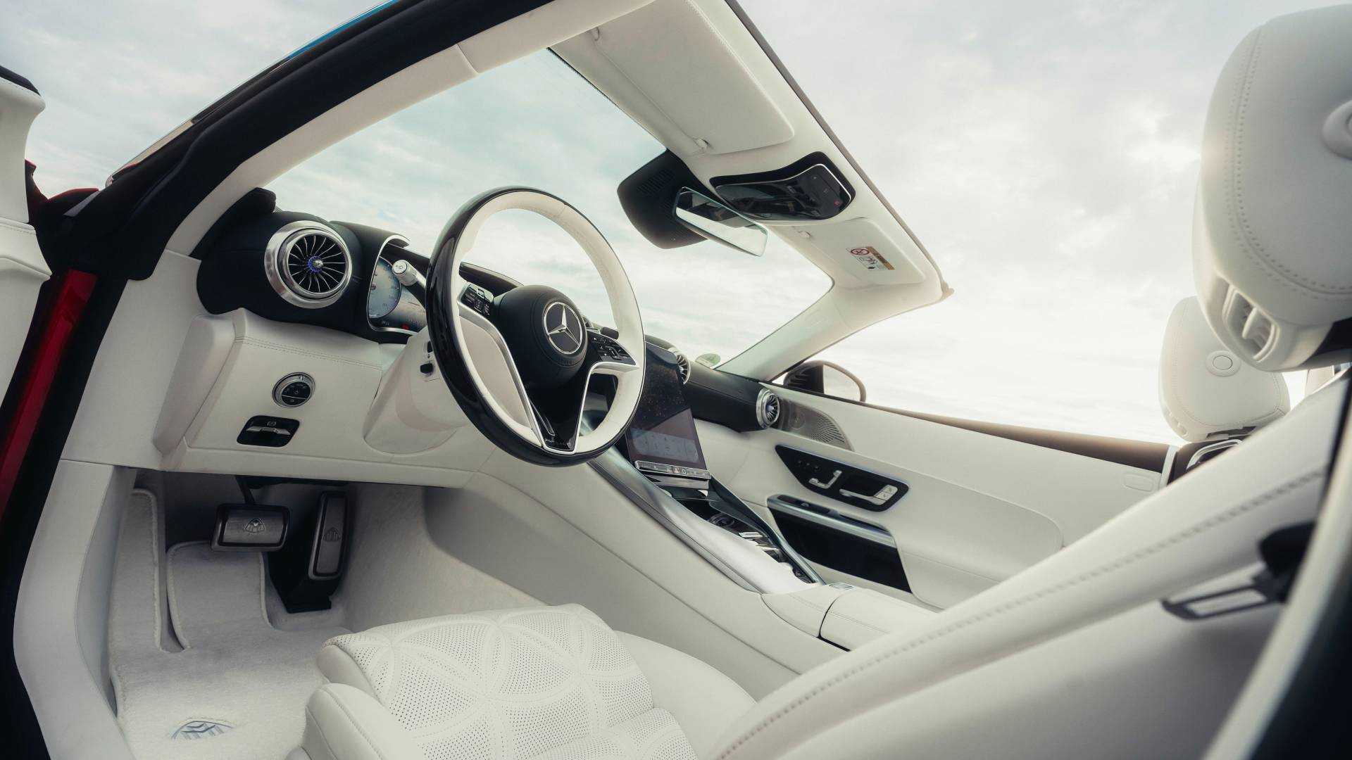 Although the SL 680 Monogram Series accommodates only two passengers, its cabin exudes luxury. Crystal-white Nappa leather adorned with an exclusive floral design covers the seats, door panels, steering wheel, and various trim elements throughout the vehicle. These are complemented by silver-chrome highlights, aligning perfectly with what one would anticipate from a Maybach. However, buyers should be aware that this opulent upholstery is their sole choice for the interior decor. Enhancing the comfortable ride quality extends beyond mere chrome trims and leather appointments; the suspension has been fine-tuned for added comfort. Additionally, extensive use of sound-dampening materials, acoustically engineered components, and a specially designed low-noise exhaust contribute to maintaining tranquility inside the cab—even when the roof is lowered.